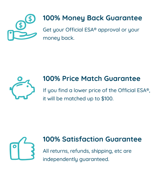 With ESA approval documents from a licensed doctor and the Official ESA® gear. You'll be confident that you have the proof needed to keep your ESA by your side.  Place your order today & you'll get instant access to order your official gear like Vests, ID cards, ID tags, certificates, leashes and more!